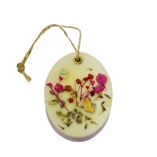 Crafted with elegance and intent, this circular wax sachet is a visual delight. Embedded with real dried botanicals — delicate rose petals 🌹, sprigs of lavender 💜, and exotic spices like cardamom pods and cloves 🌰 — the sachet looks like a miniature botanical garden preserved in creamy white wax. Each piece is handcrafted with love, ensuring that no two sachets are alike, making each one a unique piece of aromatic art. 🎨🌼