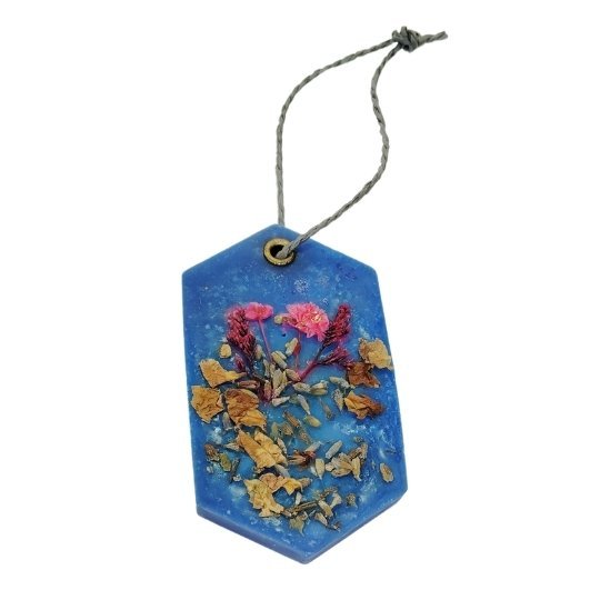 This uniquely shaped deep blue wax sachet is a visual and aromatic gem 💠. Crafted by hand with care and intention, it features an enchanting arrangement of dried botanicals—including ylang ylang blossoms, lavender buds, pink carnation petals, and rustic leaves 🍂—all thoughtfully embedded in wax.