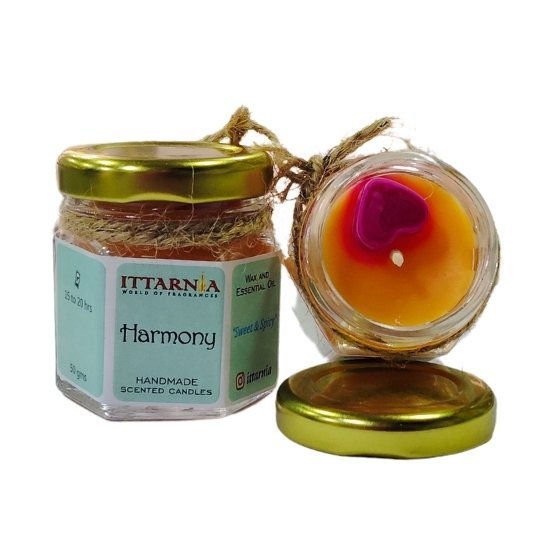 - Harmony (sweet n spicy) Fragrance Candle: – fragrances made by blending spice notes with other notes. This kind of perfumes are said to have healing effects and bring about a warm and comfortable feel. This scent tends to be light and refreshing, with a natural sweetness.